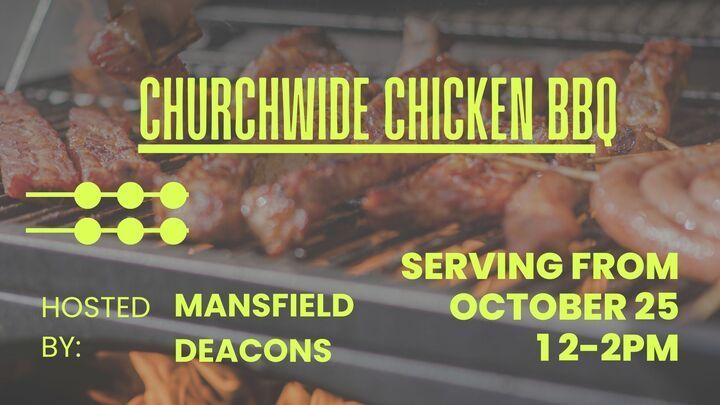 Join us for an afternoon of great food, laughter, and fellowship at our Churchwide Chicken BBQ! Our deacons will be firing up the grills and serving delicious plates of chicken with all the fixings.